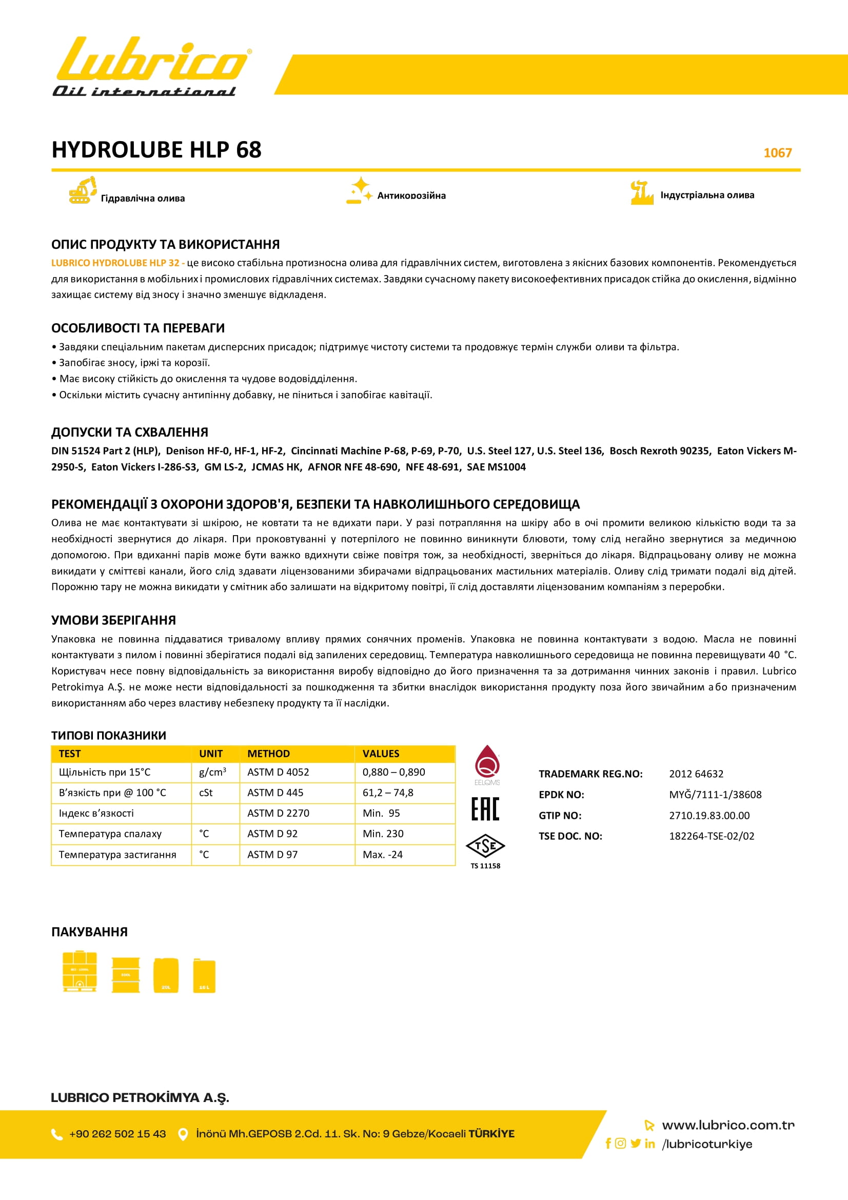 Олива гідравлічна LUBRICO HYDROLUBE HLP SERIES 68, 20л - DIN 51524 Part 2 (HLP)